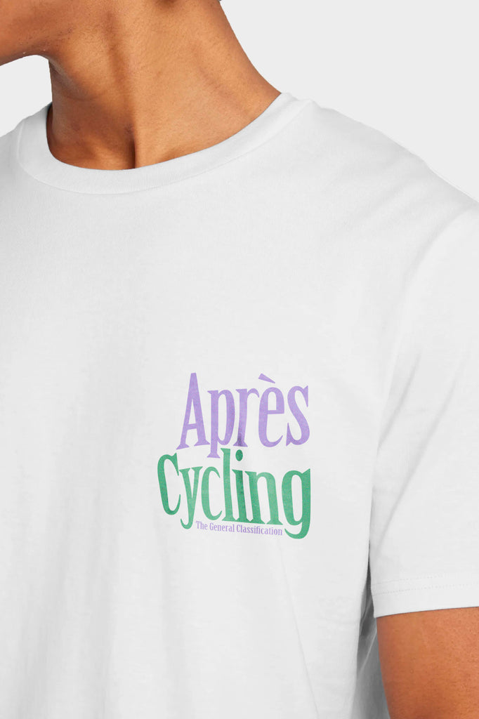 100% super-duper organic, ringspun, combed cotton. Perfectly medium fit. Printed with super eco-friendly DTG, using only water-based inks. OEKO-TEX® approved. This is the Après Cycling Chest T-Shirt by The General Classification. Nice!